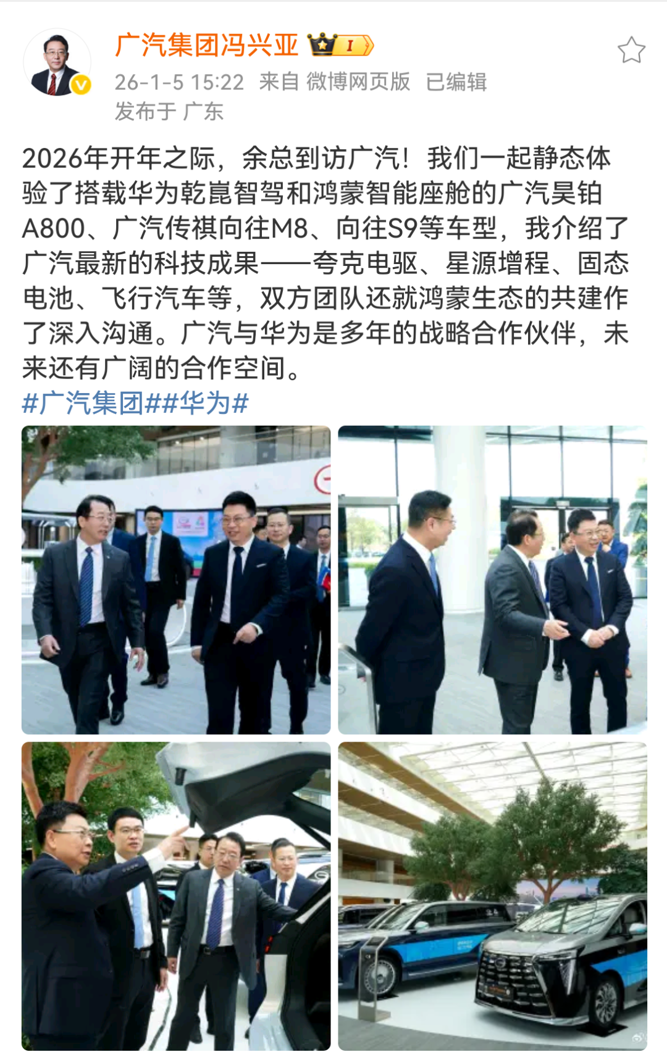 2026年1月5日,广汽集团董事长冯兴亚发布微博称,广汽集团与华为终端的团队,就鸿蒙生态共建进行了深入沟通。