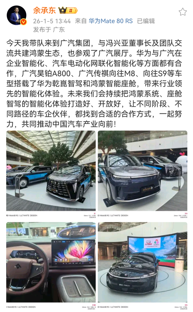 2026年1月5日,余承东发布微博称,华为与广汽集团在企业智能化、汽车电动化、网联化、智能化等方面都有合作,广汽昊铂A800、广汽传祺向往M8、广汽传祺向往S9等车型,均搭载了华为乾智驾和鸿蒙智能座舱。