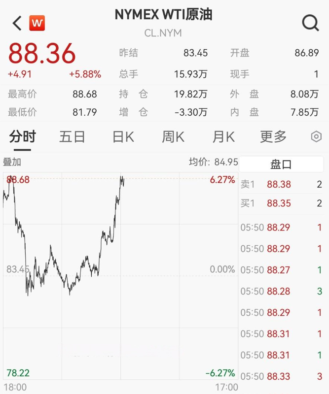 3月11日,国际油价出现大反弹。WTI原油迅速拉升,突破88美元/桶。