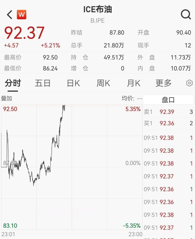 布伦特原油同步拉升,日内涨超5%,突破92美元/桶。