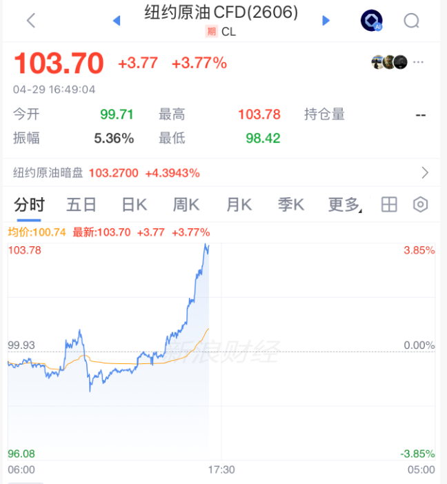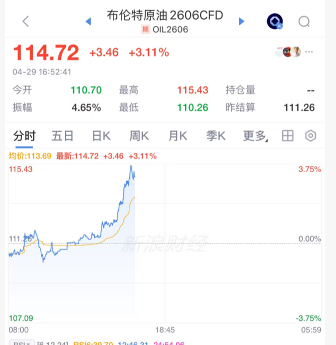 全球原油基准布伦特原油上涨3%,至每桶114美元。周二,布伦特原油已收于四周以来高位。美国基准WTI原油上涨3.77%,至每桶103.7美元。