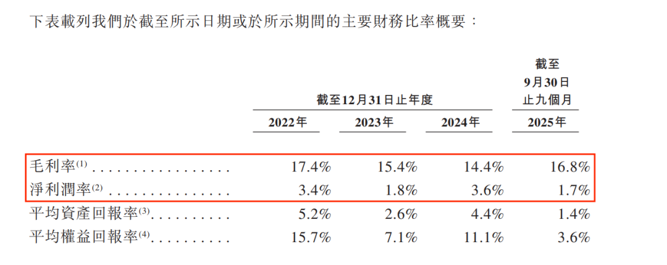 在垫付资金增加的同时,该模式的毛利率却在下降。极易科技的毛利率从2022年的17.4%降至2024年的14.4%,2025年前9个月回升至16.8%。净利率则在1.7%至3.6%之间徘徊。极易科技在2022年、2023年及2025年前9个月,经营活动所得现金流量净额均为负数。