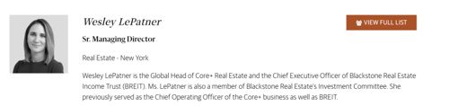 公开资料显示,韦斯利·莱帕特纳是黑石集团核心房地产全球主管及黑石房地产收入信托基金(BREIT)首席执行官。她同时担任黑石房地产投资委员会成员。此前,她曾担任核心+业务及BREIT的首席运营官。