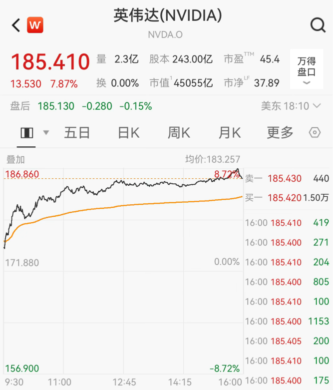 个股方面,英伟达大涨7.81%,现报185.41美元/股。