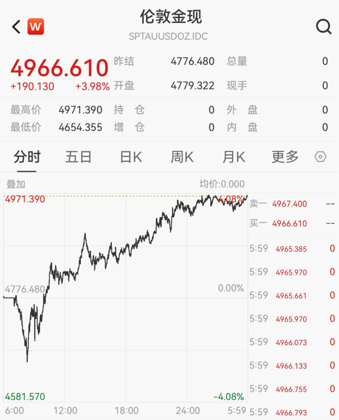 昨夜今晨,现货黄金日内暴涨近4%,最高报4971.39美元/盎司,现报4966.61美元/盎司。