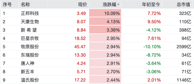 个股方面,天邦食品录得2连板,正邦科技涨停,牧原股份涨近3%,天康生物、新希望、巨星农牧、东瑞股份等跟涨。