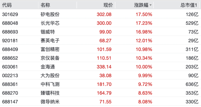 沪电股份、大族激光、江海股份、京泉华、利通电子等多股涨停,中英科技、珂玛科技涨超12%,晶品特装大涨超17%,南亚新材涨近12%。
