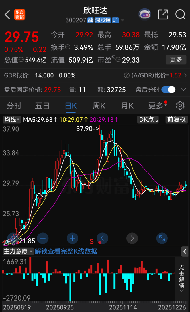 欣旺达动力是欣旺达布局动力电池业务的重要载体,而欣旺达是国内动力电池头部企业。12月26日收盘,欣旺达股价报29.75元/股,总市值达549.6亿元。