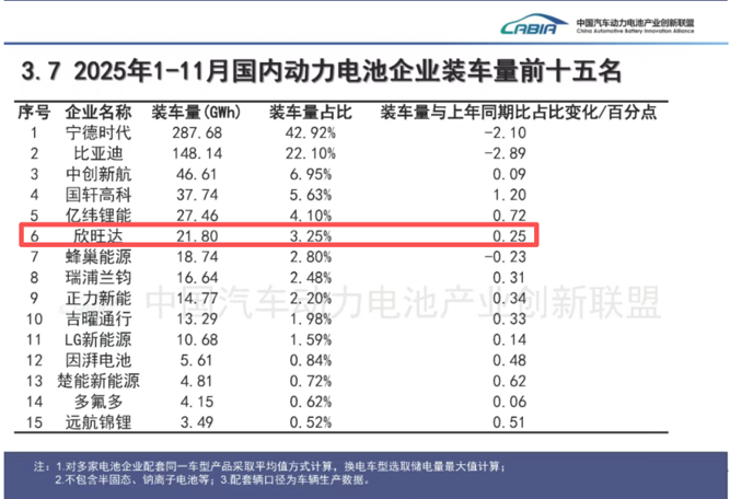 中国汽车动力电池产业创新联盟数据显示,2025年前11月,欣旺达的动力电池装车量位列国内动力电池企业第六名。