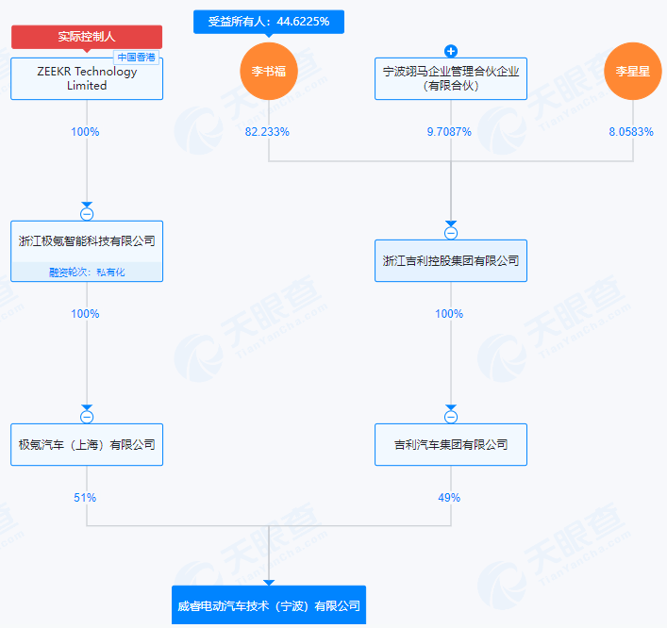天眼查显示,威睿公司的股东分别是极氪汽车(上海)有限公司、吉利汽车集团有限公司,持股比例分别为51%、49%。