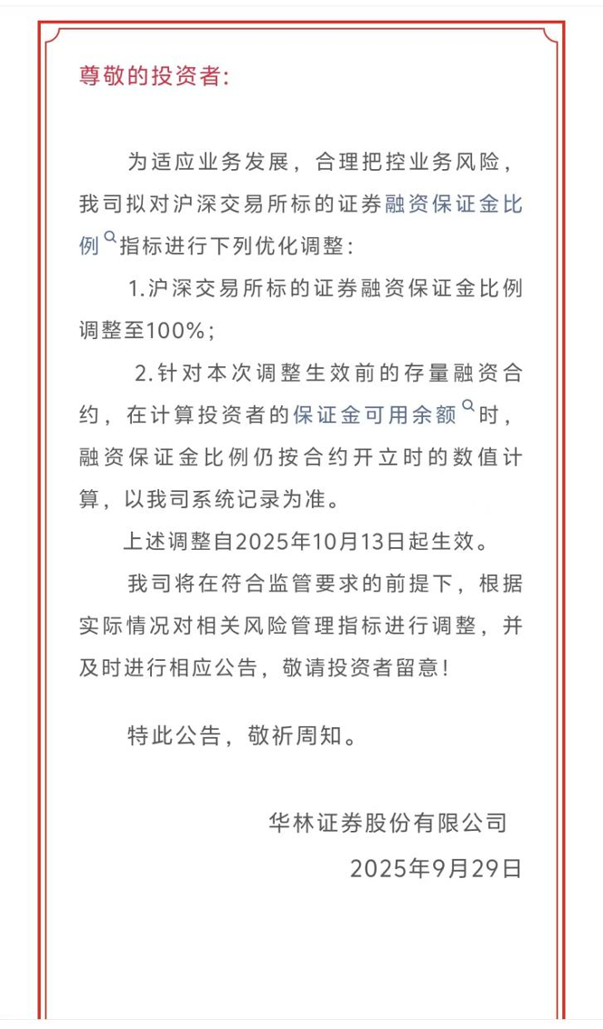 华林证券近日发布公告称,为适应业务发展并合理把控业务风险,公司将把沪深交易所标的证券的融资保证金比例统一上调至100%。该调整计划自2025年10月13日起正式生效。