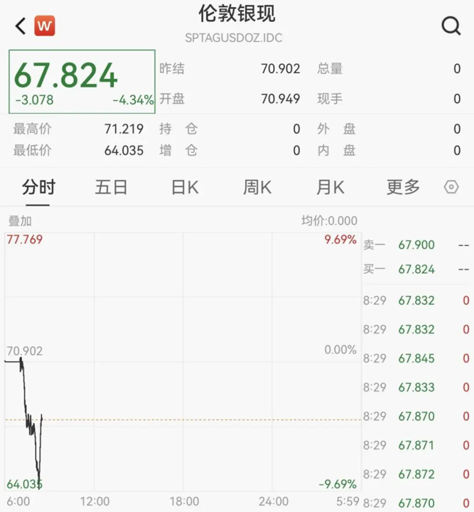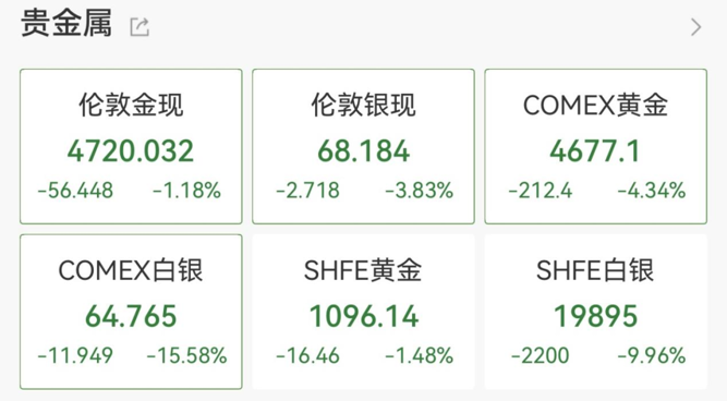现货白银早盘跳水,一度跌超9%,随后震荡反弹,现报67.82美元/盎司;现货黄金跌1.18%,现报4720.03美元/盎司。