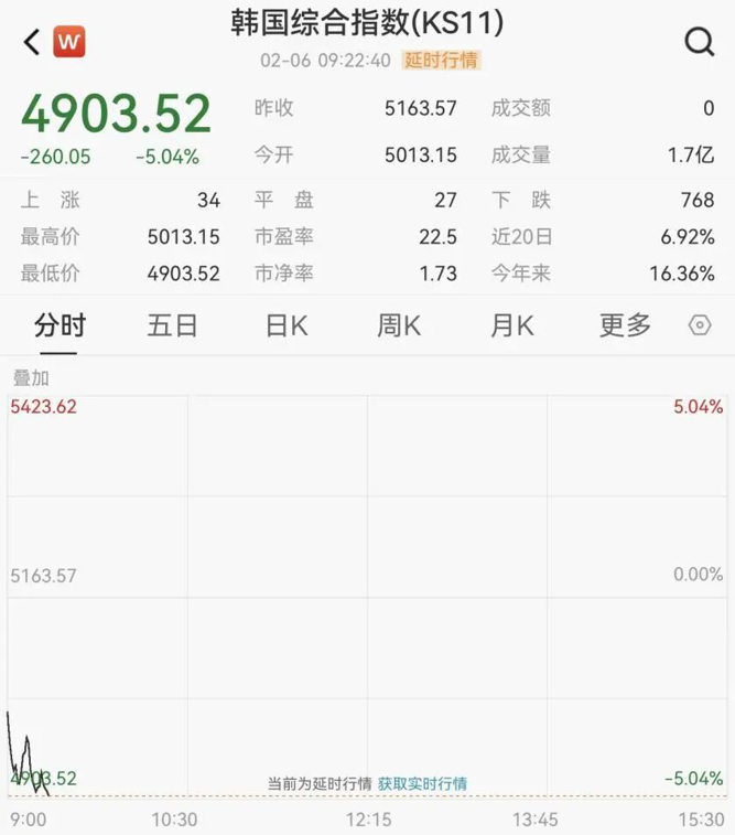2月6日,韩国综合指数开盘大跌超5%。韩国交易所因韩国KOSPI 200指数期货下跌5%,触发程序化交易暂停机制,程序化交易暂停5分钟。