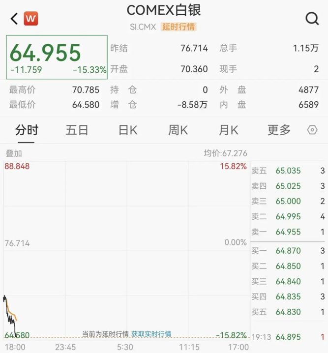 COMEX白银期货大跌超15%,最新报64.955美元/盎司。