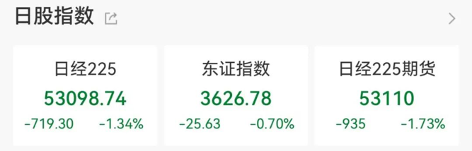 日本股市同样走低,日经225指数跌1.34%,最新报53098.74点。