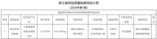 5月22日,浙江省药品监督管理局发布的《浙江省药品质量抽查检验公告(2024年第1期)》显示,由上海信谊金朱药业有限公司生产的批号为2110704的利巴韦林注射液,在浙江省丽水市质量检验检测研究院的监督抽样检验中,被发现可见异物项不符合中国药典2020年版二部的规定。