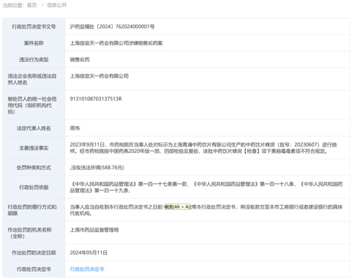 也是在5月11日,上海信谊天一药业有限公司,因销售劣药,被上海市药监局处没收违法所得588.76元。其主要违法事实是,2023年9月11日,上海市药检院在当事人处对标示为上海青浦中药饮片有限公司生产的中药饮片蜂房(批号:20230607)进行抽样。经上海市药检院按中国药典2020年版一部、四部检验及复验,该批中药饮片蜂房【检查】项下黄曲霉毒素项不符合规定。