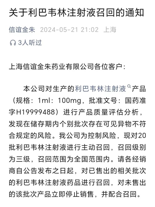 5月21日,上海信谊金朱官方微信号发文称,公司对生产的利巴韦林注射液产品(规格:1ml:100mg,批准文号:国药准字H19999488)进行产品质量评估分析,发现在储存期内个别批次存在可见异物不符合规定的风险。