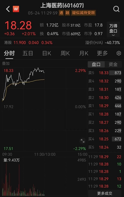 5月24日上午,上海医药以18.28元报收,上涨2.01%,市值为677亿元。