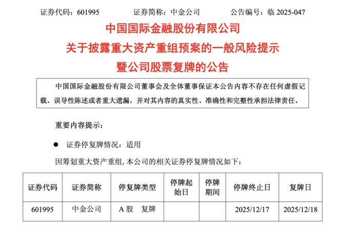 中金公司A股股票自2025年11月20日开市起停牌,将于2025年12月18日(星期四)开市起复牌。