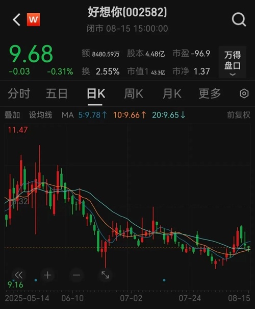 截至8月15日收盘,好想你股价报9.68元,市值超43亿元。