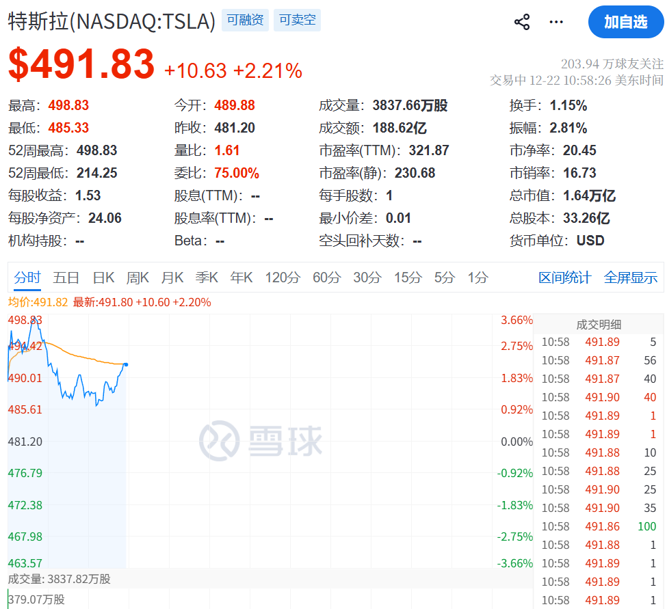 特斯拉股价盘中创历史新高,涨幅一度超过3%。