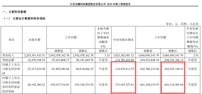 龙蟠科技的归母净利润、扣非后净利润,在2025年前三季度分别为-1.10亿元、-1.72亿元,而在2024年前三季度分别为-3.03亿元、-4.02亿元。