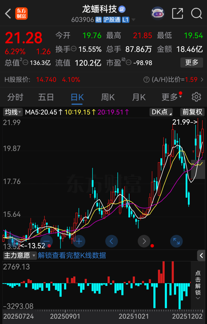 截至12月2日收盘,龙蟠科技股价报21.28元/股,涨幅达6.29%,总市值为136.3亿元。
