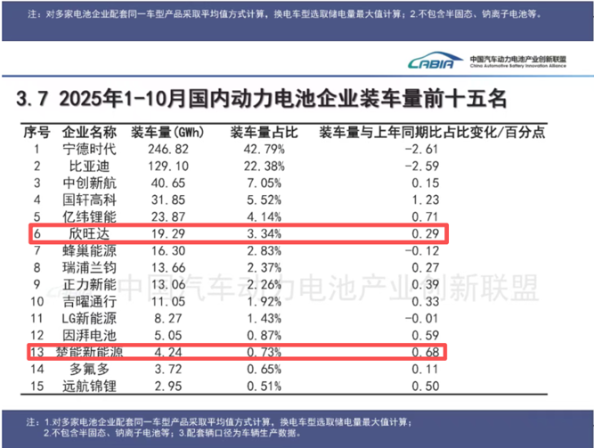 中国汽车动力电池产业创新联盟数据显示,在2025年前10月的国内动力电池企业装车量排名中,欣旺达、楚能新能源股份有限公司分别位列第6位、第13位。