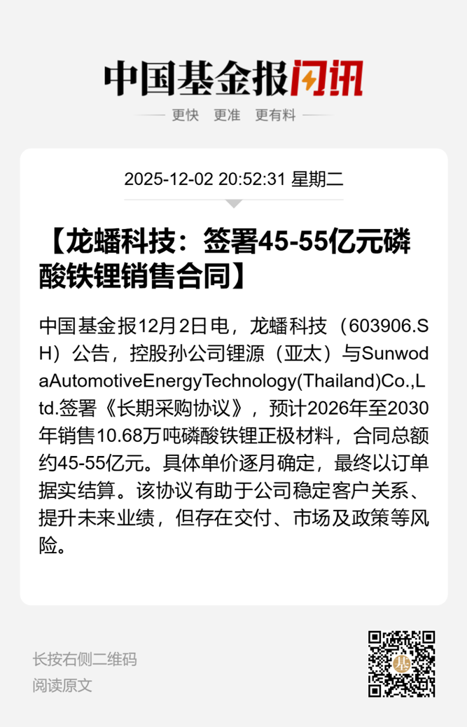 12月2日晚间,龙蟠科技发布公告称,公司控股孙公司LBM New Energy (AP) Pte.Ltd.(以下简称锂源亚太)签订《长期采购协议》,预计销售金额为45亿元至55亿元。
