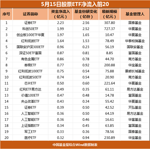 从资金净流入排行看,5月15日共有4只产品净流入超1亿元,其中,国泰基金旗下证券ETF以2.23亿元的净流入排在第一位。
