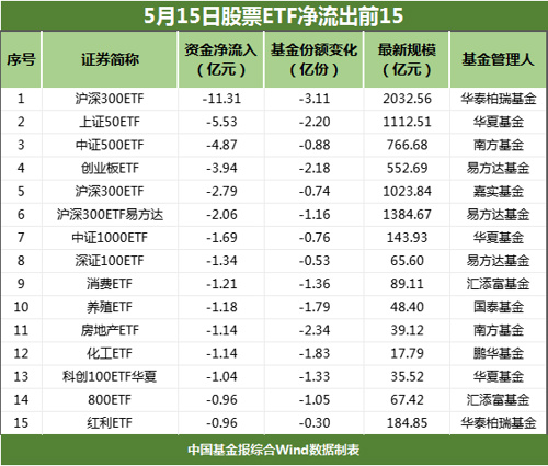 5月15日,A股三大指数震荡收跌,股票ETF市场上,出现约36.33亿元的净流出。至此,本周已连续三个交易日资金净流出。