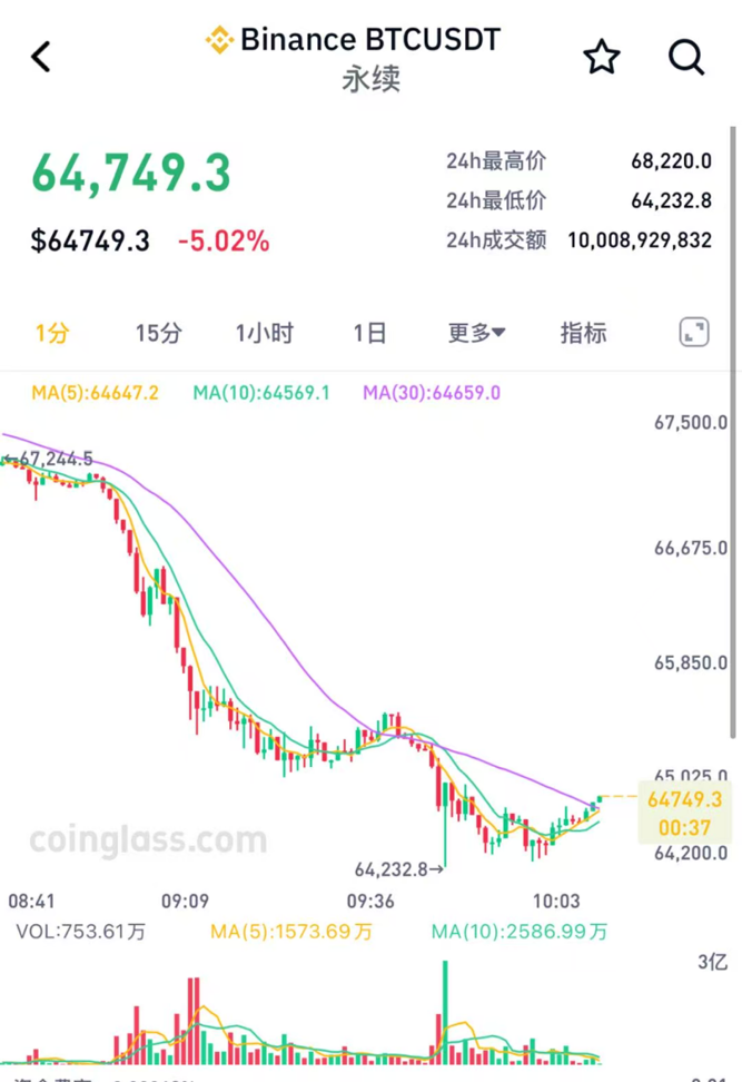 2月23日,比特币直线下跌,跌破65000美元关口,最低报64232.8美元/枚。截至发稿,报64749.3美元/枚,跌幅超5%。