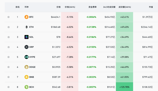 加密货币市场整体呈现下跌态势。截至发稿,以太坊、XRP币、BNB币跌幅均超6%,HYPE币跌幅超7%,SOL币跌幅超8%。