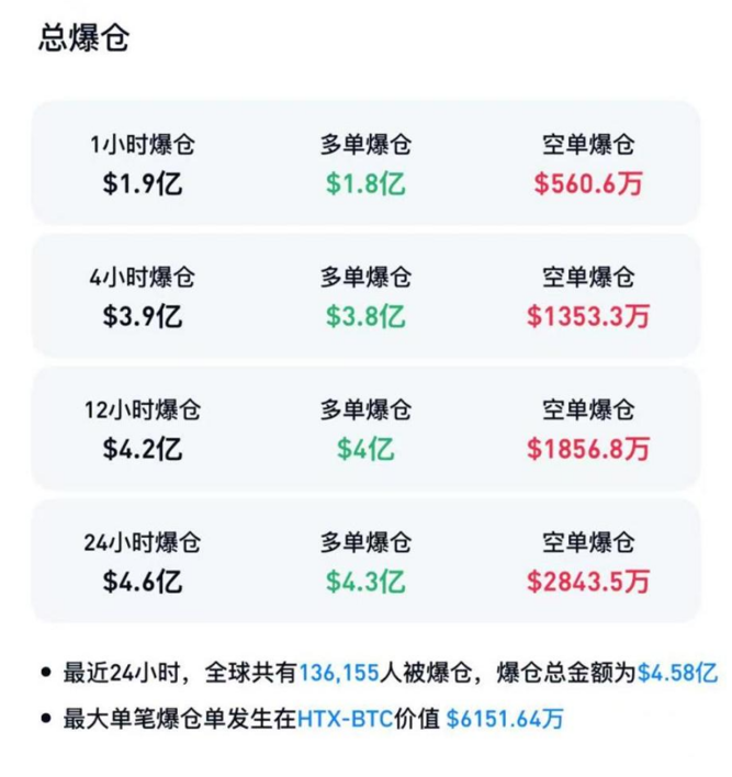 Coinglass数据显示,最近24小时内,加密货币市场超13万人被爆仓,爆仓总金额为4.58亿美元。其中,多单爆仓金额为4.3亿美元,空单爆仓金额为2843.5万美元。