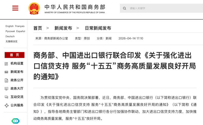 4月14日,商务部、中国进出口银行(以下简称进出口银行)联合对外发布了《关于强化进出口信贷支持 服务“十五五”商务高质量发展良好开局的通知》(以下简称《通知》),指导各地商务主管部门和进出口银行各分行加强协作联动,加大进出口信贷支持力度,加快推动商务高质量发展,服务“十五五”良好开局。