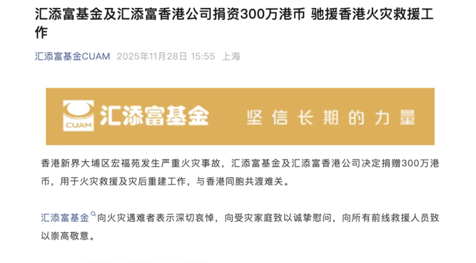 汇添富基金表示,香港新界大埔区宏福苑发生严重火灾事故,汇添富基金及汇添富香港公司决定捐赠300万港元,用于火灾救援及灾后重建工作,与香港同胞共渡难关。