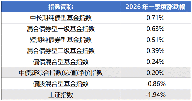 以基金指数一季度表现观察,短债、中长债、包括混债类基金指数一季度取得正收益。当市场从“高歌猛进”切换到“反复拉扯”,对确定性的追求正在重新占据上风。震荡市下,或许降低组合的整体波动,本身就是一种有意义的配置目标。