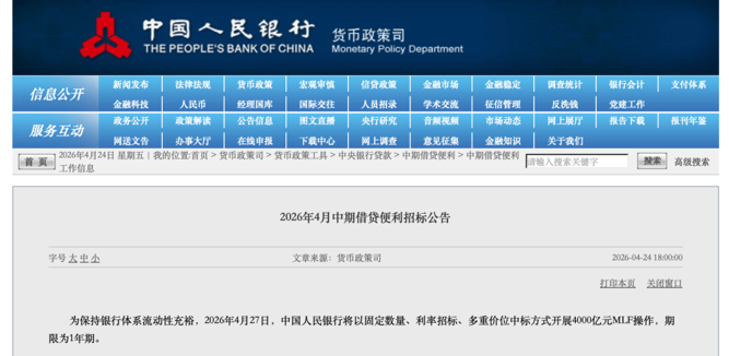 4月24日,央行发布消息称,为保持银行体系流动性充裕,2026年4月27日,中国人民银行将以固定数量、利率招标、多重价位中标方式开展4000亿元MLF操作,期限为1年期。