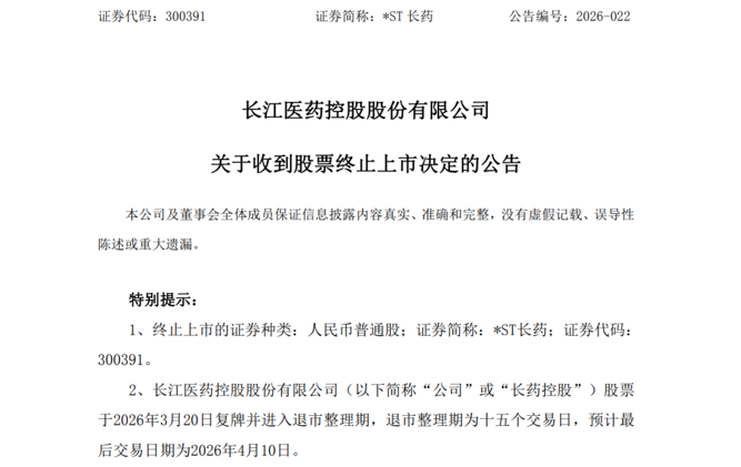 根据公告,*ST长药股票将于3月20日复牌并进入退市整理期,退市整理期为十五个交易日,预计最后交易日期为2026年4月10日。退市整理期间股票在风险警示板交易,首个交易日无价格涨跌幅限制,此后每日涨跌幅限制为20%。公司股票终止上市后,将转入全国股转公司代为管理的退市板块进行转让。