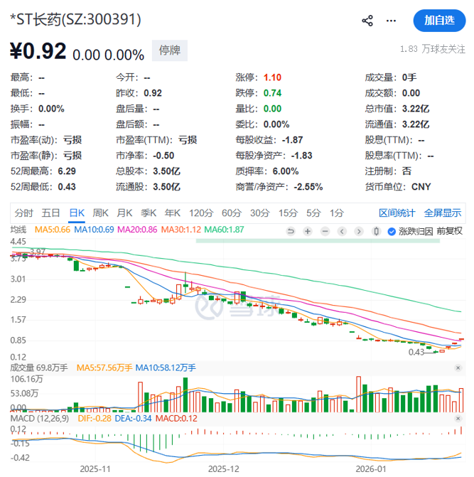 值得一提的是,*ST长药在停牌前曾连续4个交易日20cm涨停。截至1月23日收盘,*ST长药股价报0.92元/股,总市值为3.22亿元。