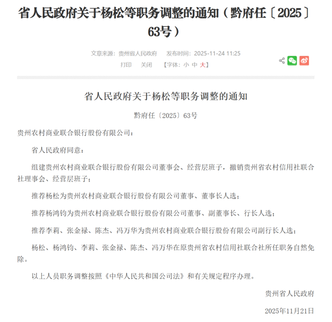 11月24日,贵州省人民政府发布关于杨松等职务调整的通知。贵州省人民政府同意:组建贵州农村商业联合银行股份有限公司董事会、经营层班子,撤销贵州省农村信用社联合社理事会、经营层班子。