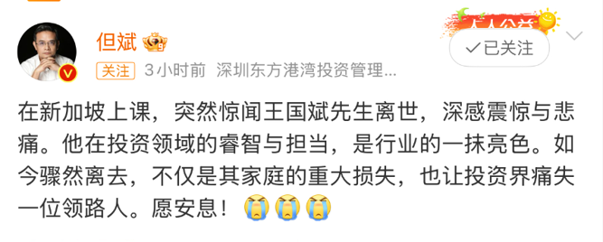 知名私募深圳东方港湾董事长但斌在社交平台表达了惋惜。他表示:“在新加坡上课,突然惊闻王国斌先生离世,深感震惊与悲痛。他在投资领域的睿智与担当,是行业的一抹亮色。如今骤然离去,不仅是其家庭的重大损失,也让投资界痛失一位领路人。愿安息!”