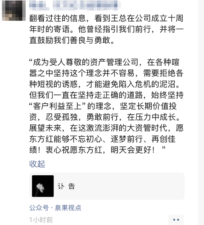 泉果基金董事长任莉已将微信头像调成黑白色的泉果基金LOGO,以寄托自己的哀思。泉果基金公募投资部基金经理赵诣也写道:“亦师亦长,一路走好。”