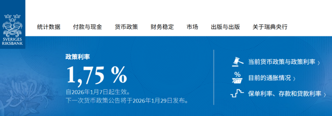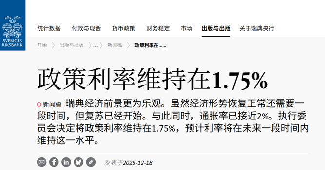 12月18日,瑞典央行宣布,维持其关键政策利率在1.75%不变。