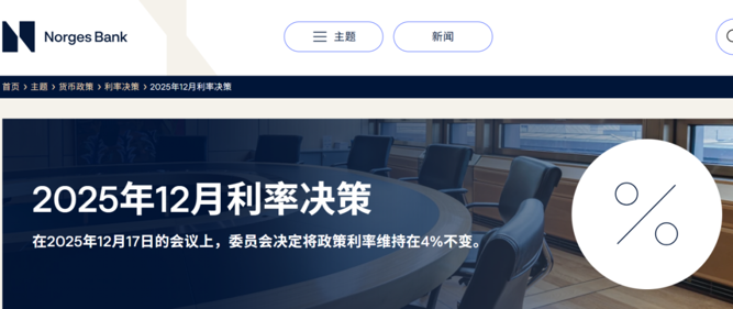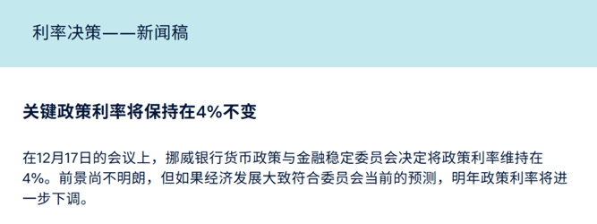 12月18日,挪威央行官网同样宣布了“不降息”的消息,政策利率维持在4%不变。前景尚不明朗,但如果经济发展大致符合当前预期,政策利率将在明年进一步下调。