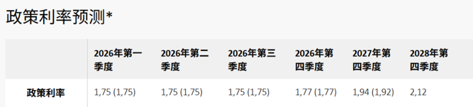 此外,瑞典央行发布最新政策利率预测。2026年第四季度利率平均值预计为1.77%,与先前预测持平;2027年第四季度和2028年第四季度的预测值分别为1.94%和2.12%,对2027年末的预测值略高于前次预测的1.92%。此次微小上修,暗示了政策制定者内部对长期利率路径的判断存在细微调整。