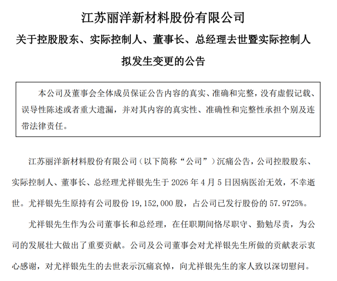 4月8日,丽洋新材发布公告称,公司控股股东、实际控制人、董事长、总经理尤祥银于2026年4月5日因病医治无效,不幸逝世。