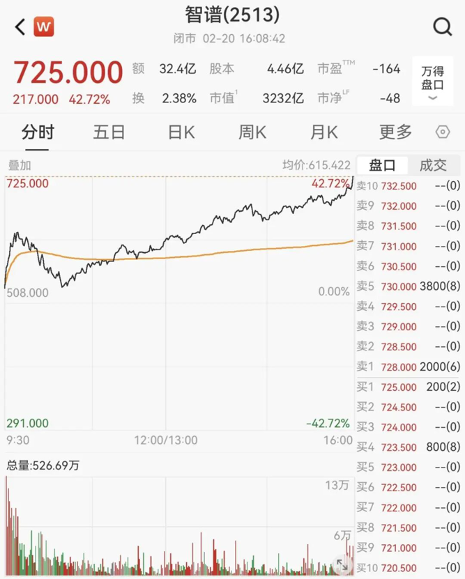 值得注意的是,2月20日,AI大模型龙头智谱股价逆市大涨,单日暴涨42.72%,报725港元/股,股价再创新高,总市值达3232亿港元。上市43天,智谱股价较116.2港元/股的发行价累计上涨524%。