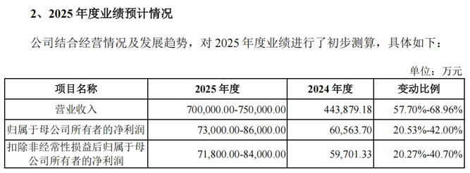 招股意向书显示,振石股份预计2025年全年的营业收入为70亿元至75亿元,同比变动比率为57.70%至68.69%;归母净利润为7.30亿元至8.60亿元,同比变动比率为20.53%至42.00%。